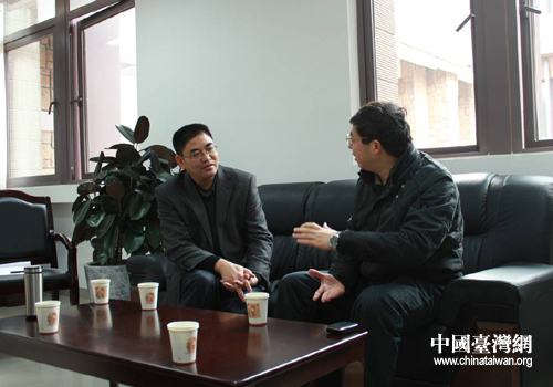綿陽(yáng)市臺(tái)辦主任陳福林(右)與北川縣委常委、組織部長(zhǎng)淳道懷(左)座談交換基層對(duì)臺(tái)工作意見(jiàn)。(圖片來(lái)源:綿陽(yáng)市臺(tái)辦)