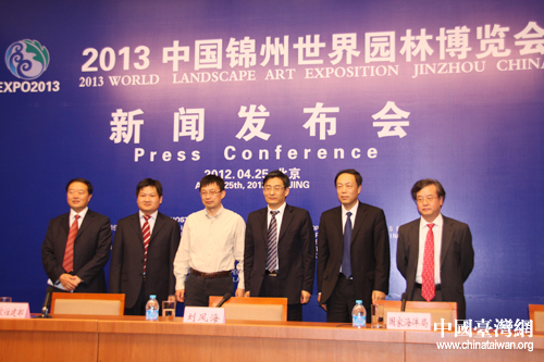 2013中國錦州世界園林博覽會新聞發(fā)布會現(xiàn)場領導合影。(中國臺灣網(wǎng) 吳怡 攝)