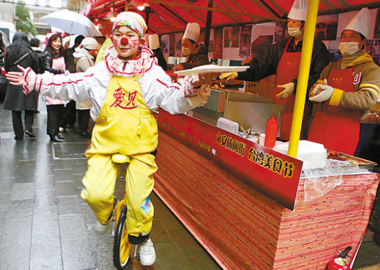 2月28日,一場融合了美食、民俗表演于一體的臺(tái)灣風(fēng)情美食節(jié)在永安休閑街向市民和游客開放。圖為一名小丑為游客表演獨(dú)輪車送餐。 本報(bào)記者 張海峰 通訊員 蔡維帥 攝