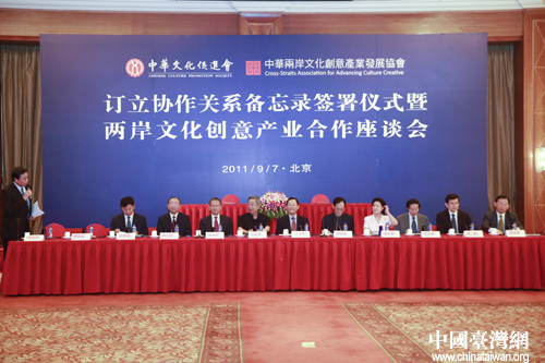 中國臺灣網9月7日北京消息 今日,中華文化促進會(以下簡稱“文促會”)與來自臺灣的中華兩岸文化創(chuàng)意發(fā)展協會(以下簡稱“文創(chuàng)會”)在京舉行了訂立協作關系備忘錄簽署儀式,并就兩岸文化創(chuàng)意產業(yè)合作展開座談。