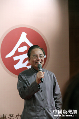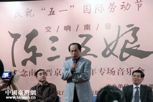 交響南音《陳三五娘》專場音樂會(huì)將于28日晚7時(shí)30分在國家大劇院音樂廳上演。圖為臺灣南音大師卓圣翔在25日下午舉行的記者會(huì)上談編唱心得。(中國臺灣網(wǎng) 楊麗 攝)