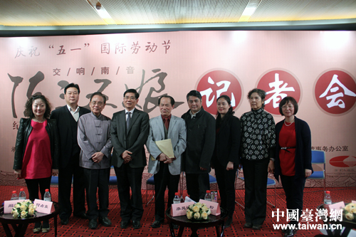 交響南音《陳三五娘》專場音樂會(huì)將于28日晚7時(shí)30分在國家大劇院音樂廳上演。圖為音樂會(huì)主辦方及主創(chuàng)人員在25日下午舉行的記者會(huì)上合影。(中國臺灣網(wǎng) 楊麗 攝)
