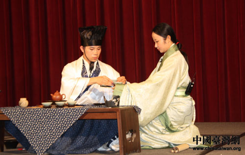 北京孔廟和國(guó)子監(jiān)博物館工作人員為兩岸師生作茶道表演。(中國(guó)臺(tái)灣網(wǎng) 李杰 攝)