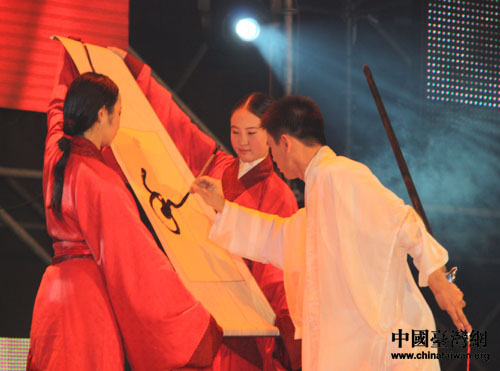 孔廟古琴教師朱慧鵬為兩岸師生作了太極舞劍和古琴表演,他表示,孔子倡導(dǎo)“六藝”,希望兩岸師生以傳統(tǒng)文化為紐帶,促進(jìn)兩岸青少年的了解和友誼。他在舞劍表演時(shí),一手持劍一手書寫漢字“和”,就是希望兩岸共建和諧中華。