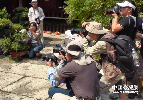 桃園縣攝影藝術(shù)協(xié)會的攝影家在調(diào)試鏡頭(圖片來源:舟山市臺辦)