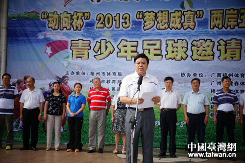 中國臺灣網(wǎng)7月19日梧州消息 7月18日,廣西梧州市體育局、教育局、臺辦、僑聯(lián)和夢想成真體育俱樂部主辦的“動向杯”2013“夢想成真”兩岸五地(梧州)青少年足球邀請賽在梧州市體育訓練基地隆重開幕。