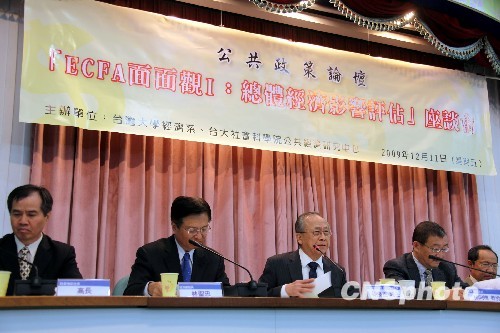 近來臺灣內(nèi)部密集討論兩岸經(jīng)濟合作框架協(xié)議(ECFA)議題,從產(chǎn)業(yè)界、經(jīng)濟主管部門到學界都各自發(fā)表獨立見解,闡述若簽署ECFA的利弊得失。圖為于臺灣大學召開的“ECFA面面觀:總體經(jīng)濟影響評估”座談會,臺灣大學經(jīng)濟系教授胡勝正(左三)、“經(jīng)濟部次長”林圣忠(左二)、“陸委會副主委”高長(左一)、臺灣大學教授林向愷(左四)等就相關(guān)議題作報告。 中新社發(fā) 曾嘉 攝