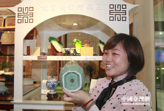 遠(yuǎn)景(故宮)文創(chuàng)生活館店員向記者展示經(jīng)銷(xiāo)的臺(tái)北故宮藏品仿品。(中國(guó)臺(tái)灣網(wǎng) 田云鵬 攝)