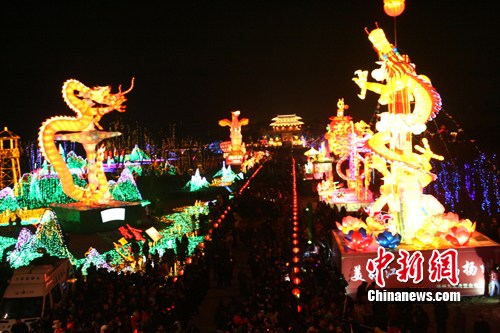 “神龍躍兩岸,盛世共和諧”2011江蘇(揚(yáng)州)燈會(huì)今晚(29日)在揚(yáng)州瘦西湖畔宋夾城正式亮燈迎客,中共江蘇省委書(shū)記羅志軍、江蘇省副省長(zhǎng)張衛(wèi)國(guó)等官員以及臺(tái)灣海峽兩岸觀光旅游協(xié)會(huì)會(huì)長(zhǎng)賴瑟珍率10多位臺(tái)灣觀光業(yè)界代表專程抵揚(yáng)州參加燈會(huì)亮燈儀式。