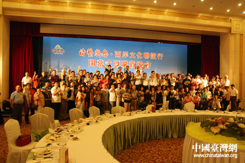 聯(lián)歡會結(jié)束時,全體兩岸嘉賓一起涌上臺前留下難忘合影。(中國臺灣網(wǎng) 蕪?fù)?攝)