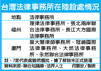 臺灣法律事務所在大陸設辦事處情況一覽。 圖片來源:臺灣《經濟日報》