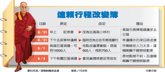 臺(tái)灣方面連日來展開危機(jī)處理,除了透過各種管道與大陸溝通外,達(dá)賴在臺(tái)灣的活動(dòng)也大幅限縮。原本昨天要開的記者會(huì)取消,原訂在高雄的萬人演講,縮小到只有500人的會(huì)場,本來在桃園巨蛋的大型演講也被取消。達(dá)賴昨天到災(zāi)區(qū)“祈!,發(fā)言也相當(dāng)審慎。