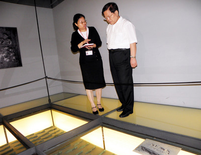 大陸文化部長蔡武(右)2日參訪臺(tái)“中研院”史研所的歷史文物陳列館,仔細(xì)聽館方人員解說。