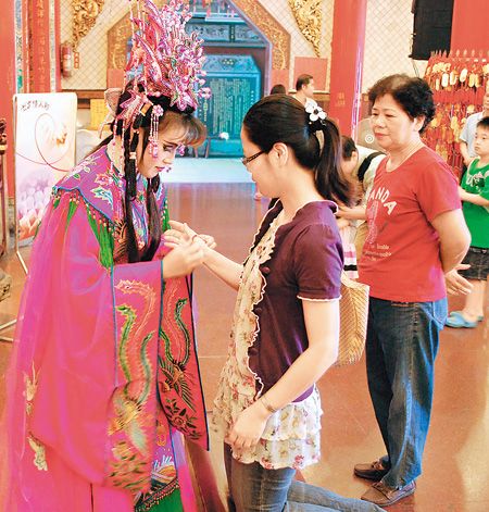 16日是農(nóng)歷七夕、中國(guó)傳統(tǒng)的情人節(jié),傳說這天是七夕娘娘的誕辰,在臺(tái)灣叫“七娘媽”,除了掌管人世間姻緣路外,更會(huì)照顧出生小孩平安長(zhǎng)大。慈鳳宮昨天找人扮演七夕娘娘,在小提琴、薩克斯風(fēng)幽揚(yáng)樂聲伴奏下,為祈求姻緣的男女信眾戴上五色珠的紅絲線,希望求得好姻緣、夫妻幸福、小兒平安。