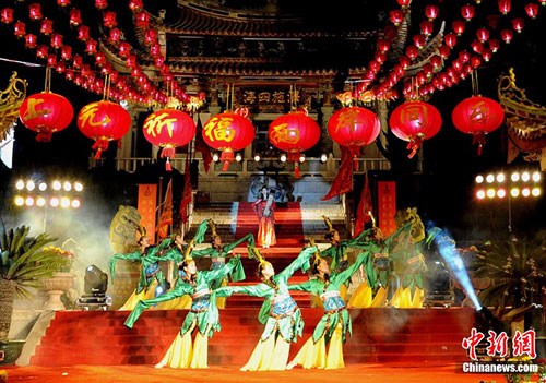 11日晚,福建湄洲媽祖祖廟舉行2011年海峽兩岸慶賞元宵佳節(jié)媽祖燈會(huì)文藝晚會(huì),兩岸藝術(shù)團(tuán)的精彩表演吸引眾多游客、信眾及島上居民駐足觀看。當(dāng)日,以“媽祖親緣,情系兩岸;同祈上元,共享升平”為主題的2011年海峽兩岸慶賞元宵佳節(jié)媽祖燈會(huì)在福建湄洲媽祖祖廟、臺(tái)灣云林北港朝天宮同時(shí)啟動(dòng),此次活動(dòng)將延續(xù)至農(nóng)歷正月十五。中新社記者 劉可耕 攝