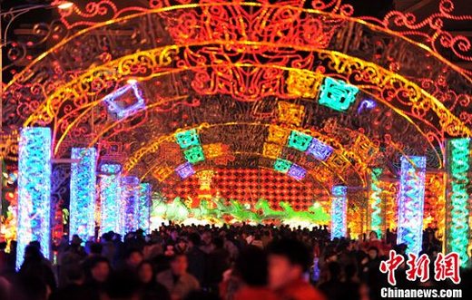 福州馬尾近600萬平方米的兩馬元宵花燈展區(qū)內(nèi)113余組大中小型彩燈、彩門12日晚正式亮燈,以此開啟2011年“兩馬同春鬧元霄”系列活動(dòng)的序幕。