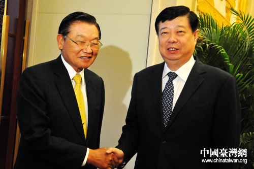 山東省委書記、省人大常委會主任姜異康與;鶗麻L江丙坤親切交談。(圖片來源:山東省臺辦)