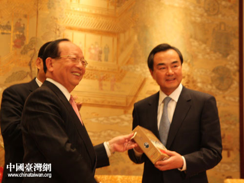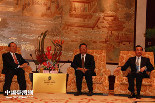 18日晚上,國(guó)臺(tái)辦主任王毅、陜西省委書(shū)記趙樂(lè)際在西安會(huì)見(jiàn)了中國(guó)國(guó)民黨副主席蔣孝嚴(yán)率領(lǐng)的臺(tái)灣企業(yè)界、工商界代表一行。(中國(guó)臺(tái)灣網(wǎng) 肖燕 攝)