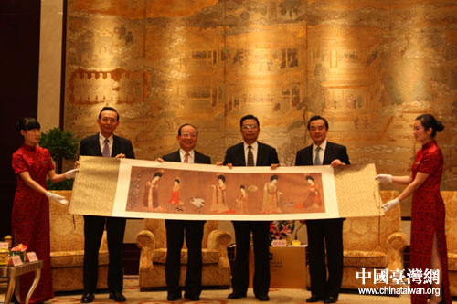 陜西省委書(shū)記趙樂(lè)際向中國(guó)國(guó)民黨副主席蔣孝嚴(yán)贈(zèng)送了唐代周昉的《簪花仕女圖》。(中國(guó)臺(tái)灣網(wǎng) 肖燕 攝)