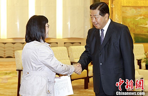 4月15日,中共中央政治局常委、全國(guó)政協(xié)主席賈慶林在北京人民大會(huì)堂會(huì)見(jiàn)了出席“2011海峽兩岸工會(huì)論壇”的臺(tái)灣工會(huì)界主要代表。中新社發(fā) 盛佳鵬 攝