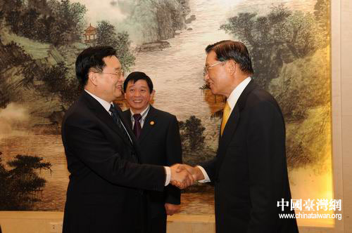 王國生與中國國民黨副主席江丙坤握手。(湖北臺辦陸勝 攝)