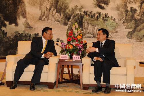 王國生與中國國民黨副主席江丙坤親切交談。(湖北臺辦陸勝 攝)