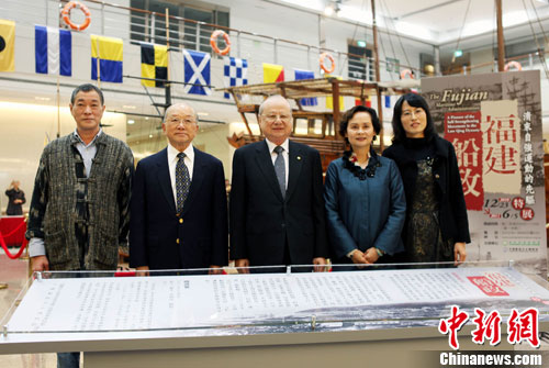 12月22日,“福建船政——清末自強(qiáng)運(yùn)動(dòng)的先驅(qū)”特展在臺(tái)北開幕。70多件文物及展品和百余幀珍貴圖片,展現(xiàn)中國(guó)近代奮發(fā)圖強(qiáng),尤其是船政沿革和海軍建設(shè)等的成就和歷程。圖為福建船政創(chuàng)辦者沈葆楨后人沈呂遂、臺(tái)灣前海軍總司令葉昌桐、長(zhǎng)榮集團(tuán)副總裁林省三、福州政協(xié)副主席陳今明(左起)等為特展開幕剪彩后合影。 中新網(wǎng)發(fā) 黃少華 攝