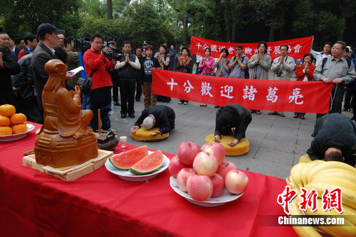 中新網(wǎng)成都4月17日電 (記者 楊杰)17日上午,在“三國(guó)圣地”成都武侯祠博物館三義廟,臺(tái)灣民間文化團(tuán)體“十分老街觀光發(fā)展協(xié)會(huì)”舉行了隆重的祭典儀式,恭迎先賢忠烈“諸葛亮”赴臺(tái),以弘揚(yáng)忠、義、仁、智的精神。