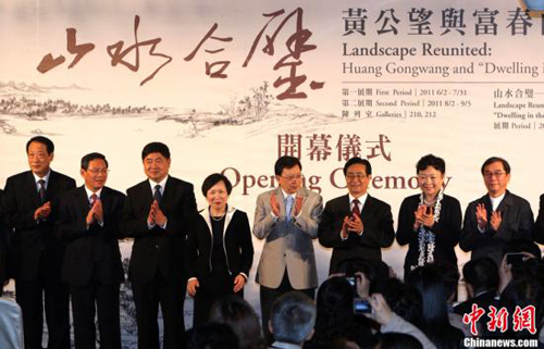 “山水合璧—黃公望與富春山居圖特展”6月1日上午在臺(tái)北故宮舉行開幕儀式。浙江省委書記趙洪祝、國家文物局局長單霽翔、臺(tái)灣中華文化總會(huì)會(huì)長劉兆玄、臺(tái)北故宮博物院院長周功鑫等出席。中新社發(fā) 趙振清 攝