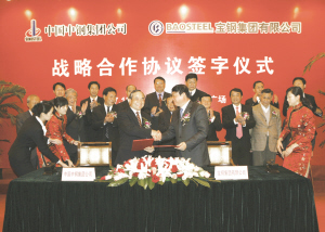 12月5日,中國中鋼集團(tuán)公司、寶鋼集團(tuán)公司在北京簽署戰(zhàn)略合作協(xié)議。雙方均表示將在已有合作的基礎(chǔ)上,重點(diǎn)在鐵礦石、鉻礦等原料的供應(yīng)、鉻鐵與鎳鐵等鐵合金的供應(yīng)、設(shè)備和資材備件的供應(yīng)、海內(nèi)外的資源開發(fā)、技術(shù)交流與合作以及工程技術(shù)等領(lǐng)域開展全方位、深層次的合作。期間,寶鋼集團(tuán)董事長徐樂江在接受記者采訪時(shí),否認(rèn)了“寶鋼收購力拓”的報(bào)道。