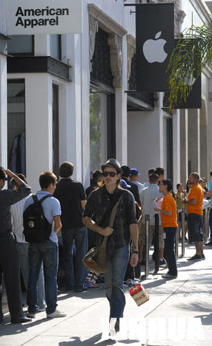 6月19日,顧客在美國加利福尼亞州帕薩迪納市的蘋果專賣店外排隊等待購買iPhone 3GS手機。蘋果公司新一代iPhone 3GS手機當天正式開始發(fā)售,許多iPhone迷在蘋果專賣店開始營業(yè)前就排起了長隊,期待第一時間拿到這款手機。 新華社記者戚恒攝