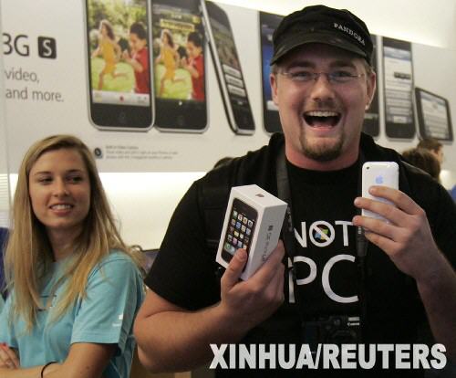 6月19日,在美國舊金山蘋果公司專賣店,一名顧客興奮地展示剛剛買到的iPhone 3GS手機。新華社/路透