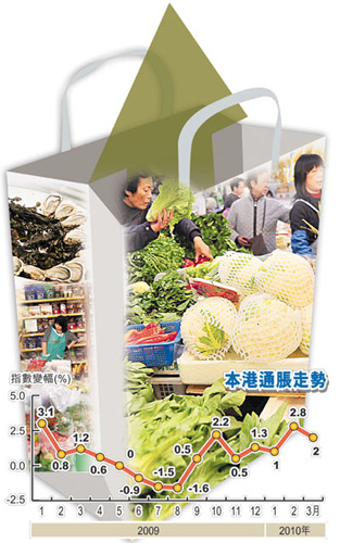 據(jù)香港文匯報(bào)報(bào)道,香港經(jīng)濟(jì)尚未全面復(fù)蘇,通脹壓力已逐步升級(jí)。特區(qū)政府統(tǒng)計(jì)處昨公布,上月綜合消費(fèi)物價(jià)指數(shù)按年上升2%,剔除港府一次性紓困措施后,基本通脹率達(dá)0.8%,當(dāng)中電力、燃?xì)饧八畲,按年急?3.7%,整體食品價(jià)格升1.3%。