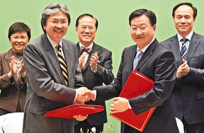 香港財政司司長曾俊華(前左)和國家商務部副部長姜增偉(前右)27日簽訂《內(nèi)地與香港關于建立更緊密經(jīng)貿(mào)關系的安排》第7份補充協(xié)議。圖片來源:文匯報