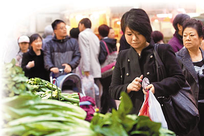 寒冷天氣下菜價急升,灣仔鵝頸橋街市源興蔬菜負責人吳先生表示,圣誕遇寒流,蔬菜供應減少,但不少市民買菜作火鍋材料,結(jié)果搶高菜價,以菜芯為例,平日售價每斤約6元,近日升至每斤9至10元,茼蒿現(xiàn)時售每斤7.5元,也較平日貴約25%;節(jié)瓜更升至每斤10元,較早前售價上升近1倍。吳先生表示,寒冷天氣影響來貨供應,倘氣溫不再進一步下降,料至元旦日菜價將維持現(xiàn)時水平,但要視乎韶關及其它廣東省地區(qū)菜場蔬菜的供港情況,如其時寒冷天氣影響收成,供不應求下不排除新年菜價更貴,市民新年勢“捱貴菜”。