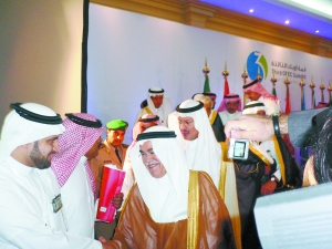 14日在新聞發(fā)布會(huì)開(kāi)始前,沙特石油部長(zhǎng)納伊米受到媒體“圍攻” 本報(bào)記者 朱周良 攝