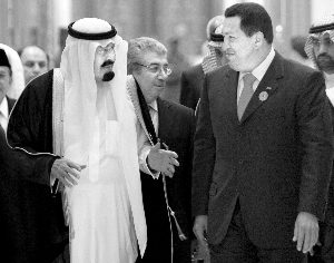 17日,沙特阿拉伯國王阿卜杜拉(左)與委內(nèi)瑞拉總統(tǒng)查韋斯參加峰會(huì)。會(huì)議東道主沙特直接表示反對(duì)。