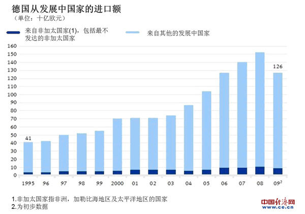 報(bào)告還稱(chēng),德國(guó)最重要的發(fā)展中國(guó)家進(jìn)口國(guó)是中國(guó)。德國(guó)2009年從中國(guó)的進(jìn)口額為550億歐元,是1995年的6.5倍。