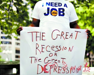 一失業(yè)者手持“經(jīng)濟大衰退或經(jīng)濟大蕭條”牌子