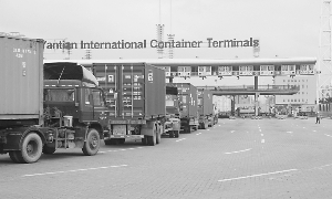 在集裝箱碼頭閘口前看到,運(yùn)載集裝箱的貨車已經(jīng)排起了近500米的長(zhǎng)龍,而后面還不斷有貨車加入。