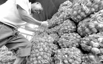 一名搬運(yùn)工人正在河南省杞縣大蒜市場(chǎng)將蒜商收購的新蒜裝車運(yùn)往山東。新華社記者 趙鵬 攝