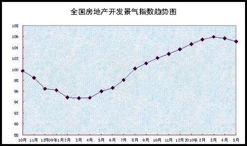 5月份,全國房地產(chǎn)開發(fā)景氣指數(shù)(簡稱“國房景氣指數(shù)”)為105.07,比4月份回落0.59點,比去年同期提高9.13點。