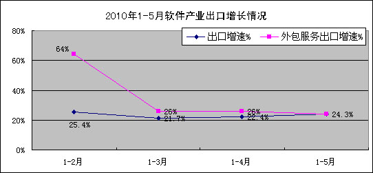 1-5月,我國軟件出口83.4億美元,同比增長24.3%,增幅低于去年同期29.9個百分點。其中軟件外包服務(wù)出口9.3億美元,同比增長24.3%,增速低于全行業(yè)平均水平5.1個百分點。