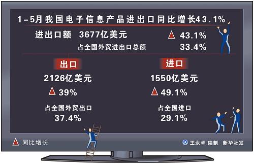圖表:1-5月我國電子信息產(chǎn)品進(jìn)出口同比增長43.1%。 新華社發(fā)
