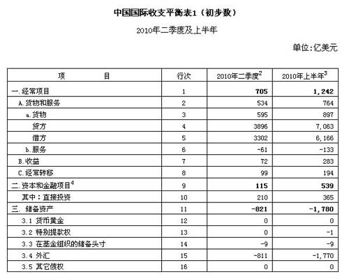 數(shù)據(jù)顯示,二季度,經(jīng)常項目順差705億美元,同比增長30%。其中,按照國際收支統(tǒng)計口徑計算,貨物貿(mào)易順差595億美元,服務(wù)貿(mào)易逆差61億美元,收益順差72億美元,經(jīng)常轉(zhuǎn)移順差99億美元。資本和金融項目順差(含凈誤差與遺漏)115億美元。其中,直接投資凈流入210億美元。國際儲備資產(chǎn)增加821億美元,按可比口徑,同比下降17%。其中,外匯儲備資產(chǎn)增加811億美元(不含匯率、價格等非交易價值變動影響),在基金組織的儲備頭寸增加9億美元。