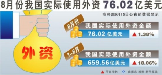新華網(wǎng)北京9月15日電(記者王希)商務(wù)部15日公布的數(shù)據(jù)顯示,8月份全國實(shí)際使用外資76.02億美元,同比增長1.38%。前8個(gè)月,我國累計(jì)吸收外資659.56億美元,同比增長18.06%。