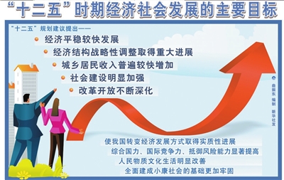 《建議》提出,綜合考慮未來發(fā)展趨勢和條件,今后五年經(jīng)濟(jì)社會發(fā)展的主要目標(biāo)是:經(jīng)濟(jì)平穩(wěn)較快發(fā)展,經(jīng)濟(jì)結(jié)構(gòu)戰(zhàn)略性調(diào)整取得重大進(jìn)展,城鄉(xiāng)居民收入普遍較快增加,社會建設(shè)明顯加強(qiáng),改革開放不斷深化。經(jīng)過全國人民共同努力奮斗,要使我國轉(zhuǎn)變經(jīng)濟(jì)發(fā)展方式取得實質(zhì)性進(jìn)展,綜合國力、國際競爭力、抵御風(fēng)險能力顯著提高,人民物質(zhì)文化生活明顯改善,全面建成小康社會的基礎(chǔ)更加牢固。