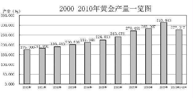 2010年10月,全國產(chǎn)金28.735噸,1-10月累計產(chǎn)金277.017噸。其中黃金礦產(chǎn)金227.508噸,同比增長7.52%,有色副產(chǎn)金49.509噸,同比增長15.26%。