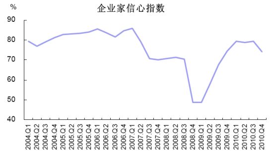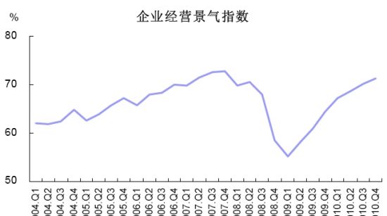 2010年第4季度,中國(guó)人民銀行在全國(guó)進(jìn)行了企業(yè)家問(wèn)卷調(diào)查,調(diào)查結(jié)果顯示:企業(yè)家信心高位回落;企業(yè)經(jīng)營(yíng)狀況良好,景氣指數(shù)連續(xù)第七個(gè)季度攀升,未來(lái)預(yù)期謹(jǐn)慎樂(lè)觀;國(guó)內(nèi)訂單繼續(xù)上行,出口訂單出現(xiàn)下滑;原材料價(jià)格上升明顯;支付能力創(chuàng)新高;企業(yè)投資意愿轉(zhuǎn)升為降,出現(xiàn)波動(dòng)。