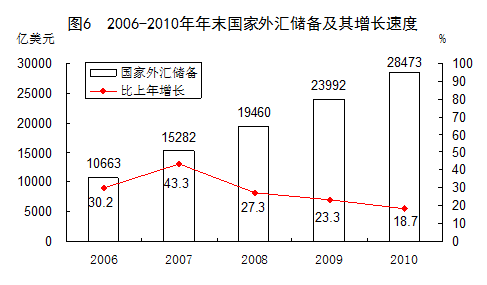 年末國(guó)家外匯儲(chǔ)備28473億美元,比上年末增加4481億美元。年末人民幣匯率為1美元兌6.6227元人民幣,比上年末升值3.0%。